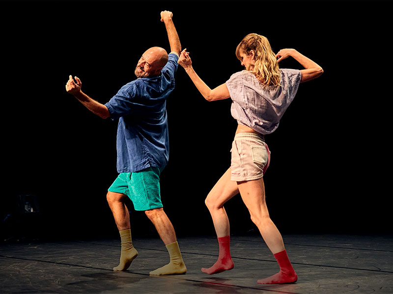Tout commence par un TikTok suivi de petites séquences joyeuses, de railleries et bougonneries, de sirtaki, de valse, de jazz ou encore de la fameuse danse de Rabbi Jacob. Des danses reconnaissables, populaires, faisant partie de l’inconscient collectif et donnant instinctivement l’envie de participer. Gilles Verièpe y construit son histoire, déploie son univers, parsème sa chorégraphie de mouvements de cours de récréation, marelle ou saut à l’élastique, et illumine le jeu, enclenche la dynamique. La salle participe comme un seul corps, entre en symbiose avec les danseurs car, de toutes ces expressions, il n’est question que de partage et de générosité.